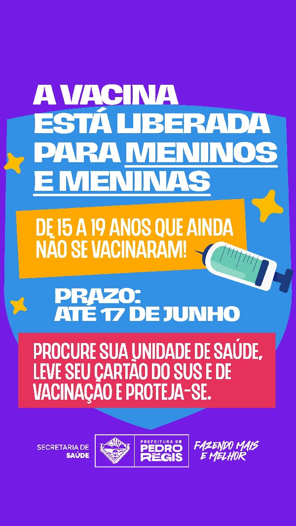 A Prefeitura de Pedro Régis está realizando uma importante campanha de vacinação contra o HPV, direcionada a meninos e meninas de 15 a 19 anos, que será realizada até o dia 17 de junho.