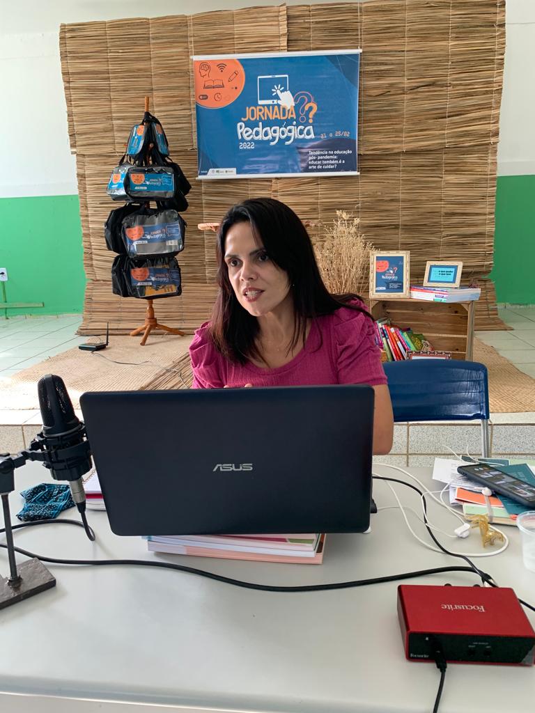 Junto com a prefeita Michele Ribeiro, a secretária Érika Maria fez questão de dar as boas-vindas aos profissionais on-line. A palestrante do dia, Professora Dra. Arilu Cavalcante, abordou os desafios e "caminhos da educação pós-pandemia", tema da palestra magna do dia.