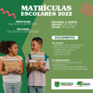 A Secretaria Municipal de Educação (Smeduc) iniciou nesta quarta-feira, 10, o período de renovação de matrículas para as Escolas Municipais de Pedro Régis. Estudantes da Educação Infantil, Ensino Fundamental I e II, e EJA, têm até o dia 10 de dezembro para atualização dos dados e garantirem a vaga para o próximo ano letivo.Pai, mãe ou responsável deve procurar a secretaria da Escola em que o filho/a já estuda, de segunda a quinta-feira, pela manhã: das 08h00 às 11h00, ou pela tarde: das 13h00 às 15h00, levando os documentos pessoais do estudante e do responsável. Para alunos/as novatos/as, o período de matrículas acontece a partir de 07 de janeiro.Ascom Pedro Régis