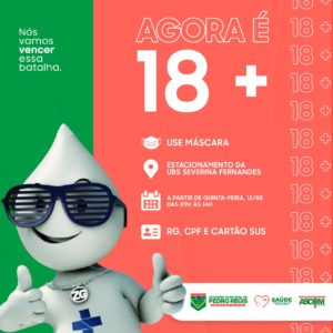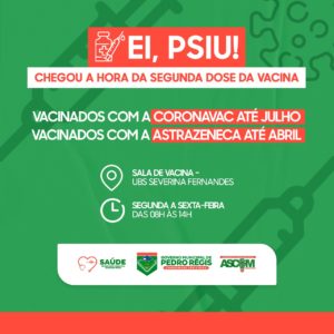 A Secretaria Municipal de Saúde de Pedro Régis (SMS) avança para mais uma etapa de imunização. Todas as pessoas acima dos 18 anos de idade devem receber a 1ª dose do vacina contra a Covid-19, no mutirão que acontece nesta quinta-feira, 12, no estacionamento da UBS Severina Fernandes, das 09h às 14h. Os documentos necessários são: cartão do SUS, RG e CPF.REFORÇO DA VACINAA SMS também alerta para o reforço da 2ª dose para quem se vacinou com a Coronavac até o mês de julho, ou AstraZeneca até o mês de abril.De acordo com a Secretaria, só após a segunda dose da vacina o ciclo de imunização é completo. Os imunizados com a 1ª dose, já podem se dirigir até a sala da vacina na UBS Severina Fernandes, de segunda a sexta-feira, das 09h às 14h.Ascom Pedro RégisGostou desse conteúdo? Compartilhe com os amigos em suas redes sociais, e se você tem uma sugestão de pauta e quer ver o assunto aqui, entre em contato pelo e-mail: comunicacao@pedroregis.pb.gov.br, com o assunto: #sugestãodepauta.
