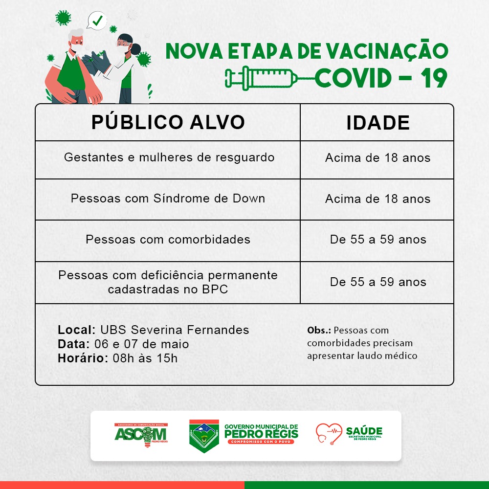 A Secretaria Municipal de Saúde de Pedro Régis (SMS) inicia nesta quinta-feira, 06, a nova etapa de vacinação contra Covid-19, que nessa nova fase atenderá outros grupos, veja quais são no quadro abaixo: