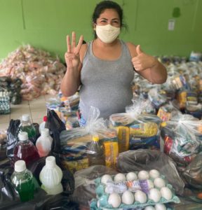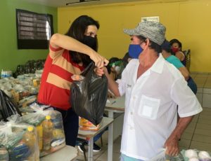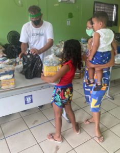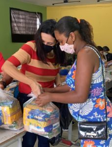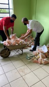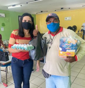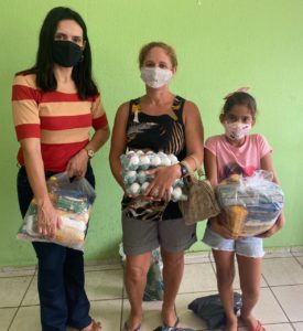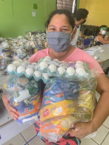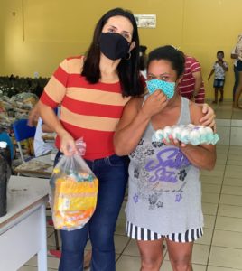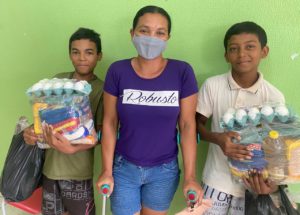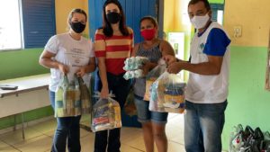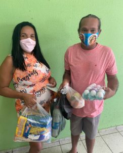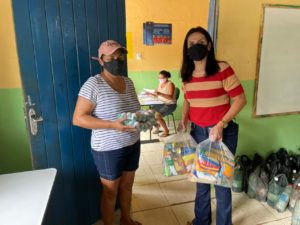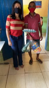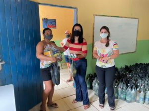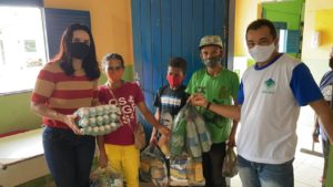 Diferente de outros anos, agora, cada aluno recebeu uma cesta básica e um kit. Há famílias, por exemplo, que receberam cinco cestas (número de alunos matriculados em casa). As famílias receberam kits contendo: 01 kg de arroz, 01 kd de feijão, 01 kg de açúcar, 02 pct de fubá, 01 pct de carne de soja, 01 pct de leite, 01 pct de biscoitos, 01 lt de óleo, 01 cartela com ovos, além de produtos da agricultura familiar (macaxeira, cebola, cenoura), e produtos de limpeza (água sanitária e desinfetante).