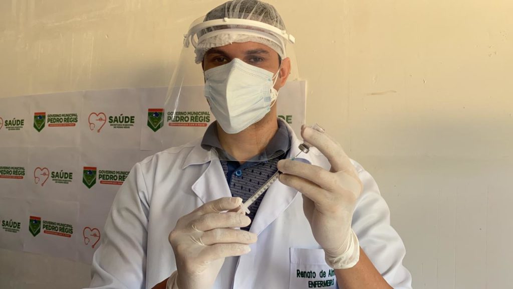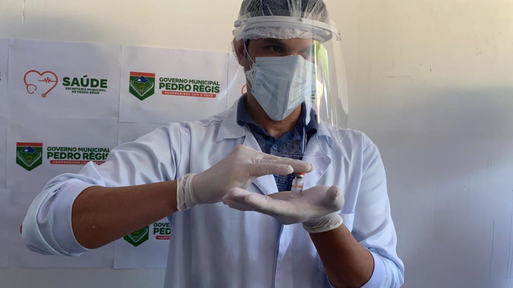 Dr. César Dias, dentista e servidor público do Governo Municipal de Pedro Régis há 21 anos, foi o primeiro a receber a dose da vacina contra a Covid-19 no município, na manhã desta quarta-feira, 20. A campanha de imunização começou vacinando profissionais da saúde da linha de frente das unidades, num  ato simbólico realizado na sede da Secretaria da Saúde.